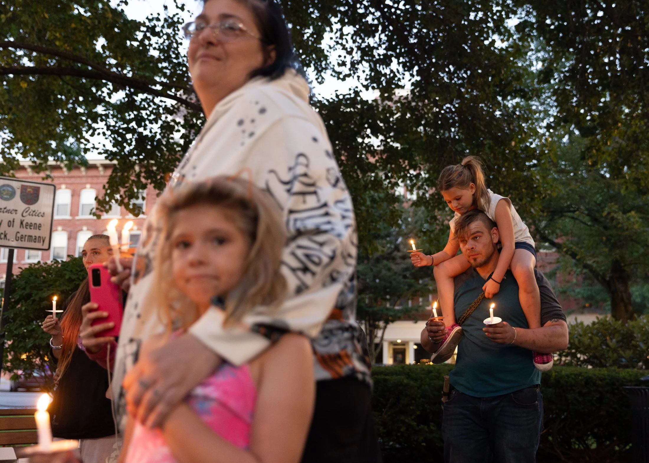 Nickolas Burt of Keene holds his niece Rhayne, 7, on his shoulders with friends and family at Thursday evening's overdose awareness vigil in Keene, August 31, 2023. During the vigil, Burt was recognized for celebrating 30 days in recovery that same week. Overdose rates are on the rise again in the region, with 198 confirmed fatalities this year so far, 106 from fentanyl alone.