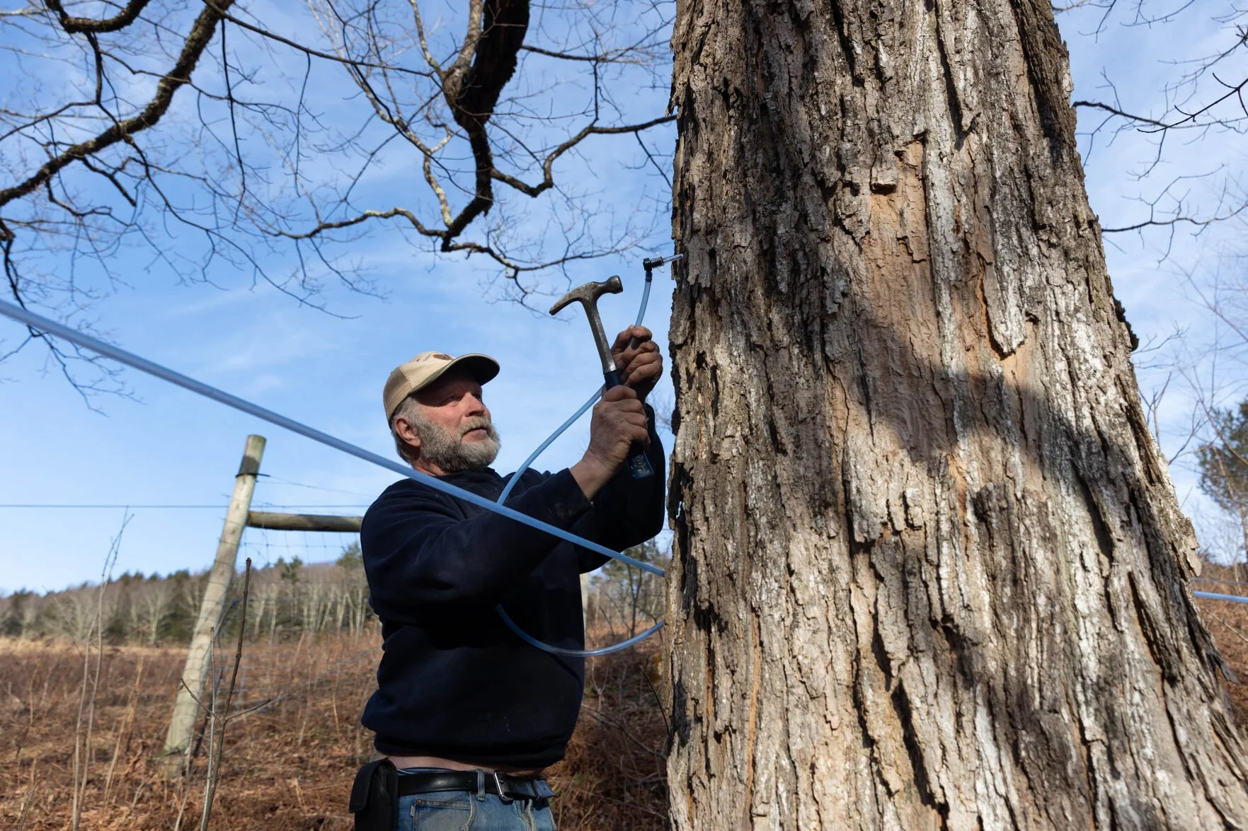 Dave Clark of Clark’s Sugar House and Valley View Farm secures the tap on a maple tree near his sugar house in Acworth, N.H., on Friday afternoon. Clark’s Sugar House maintains a chart with boil dates, number of taps used and gallons of maple syrup produced each year at the sugar house in Acworth. Clark boiled in early February this year due to a warmer winter in New England.