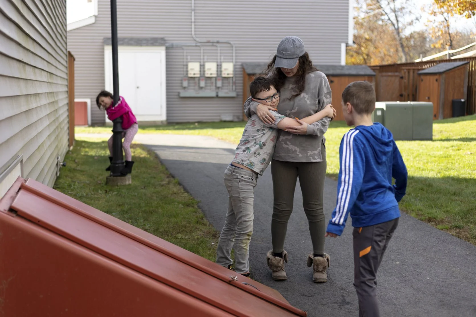 Serinna Hardy breaks up a fight between her kids after school Thursday as they take turns challenging each other to races around their housing complex in Keene. Hardy has been struggling with addressing her son Jaiden’s mental health issues and anger outbursts, and says she cannot find consistent professional mental health support for him.