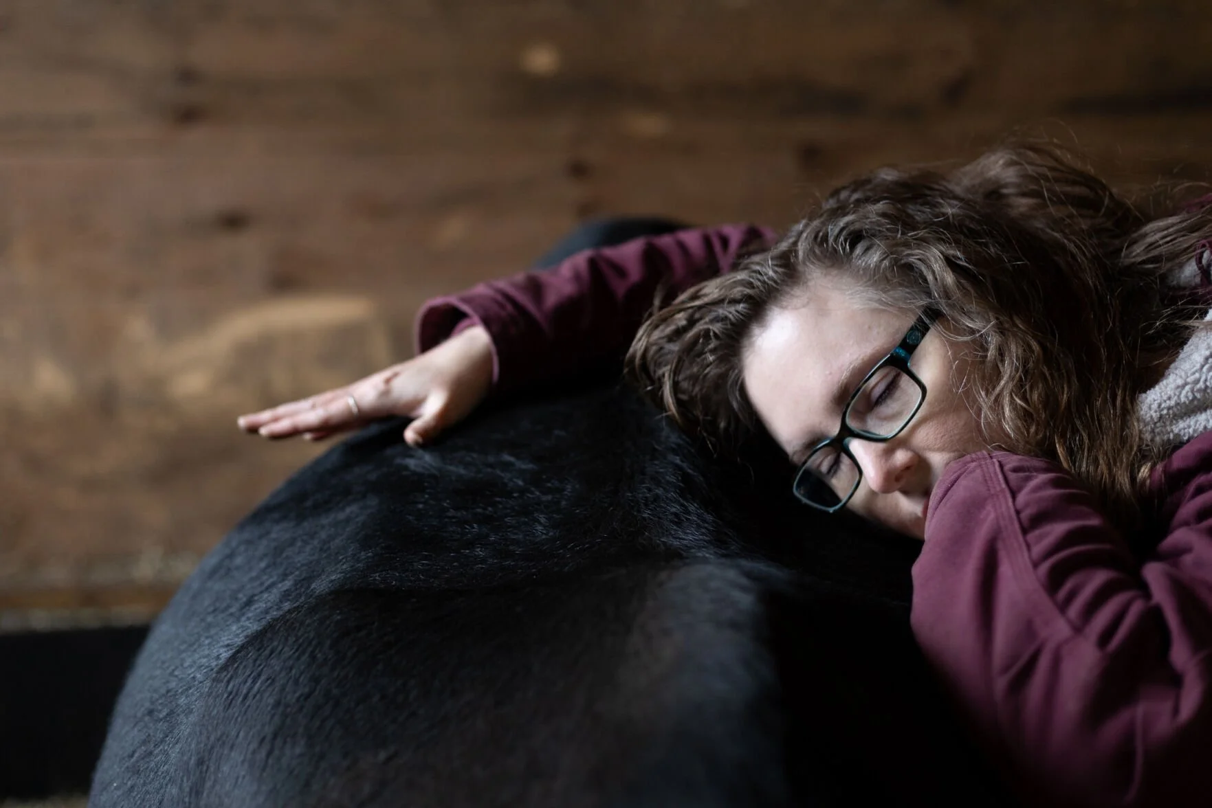Laura Bradford of Granite Oak Farm in Harrisville embraces Lilly the cow, who is available for cuddles from guests. The Bradfords reopened the farm in Harrisville in August after moving it from Goffstown and were booked their opening weekend by community members waiting for the relaxing experience to resume.
