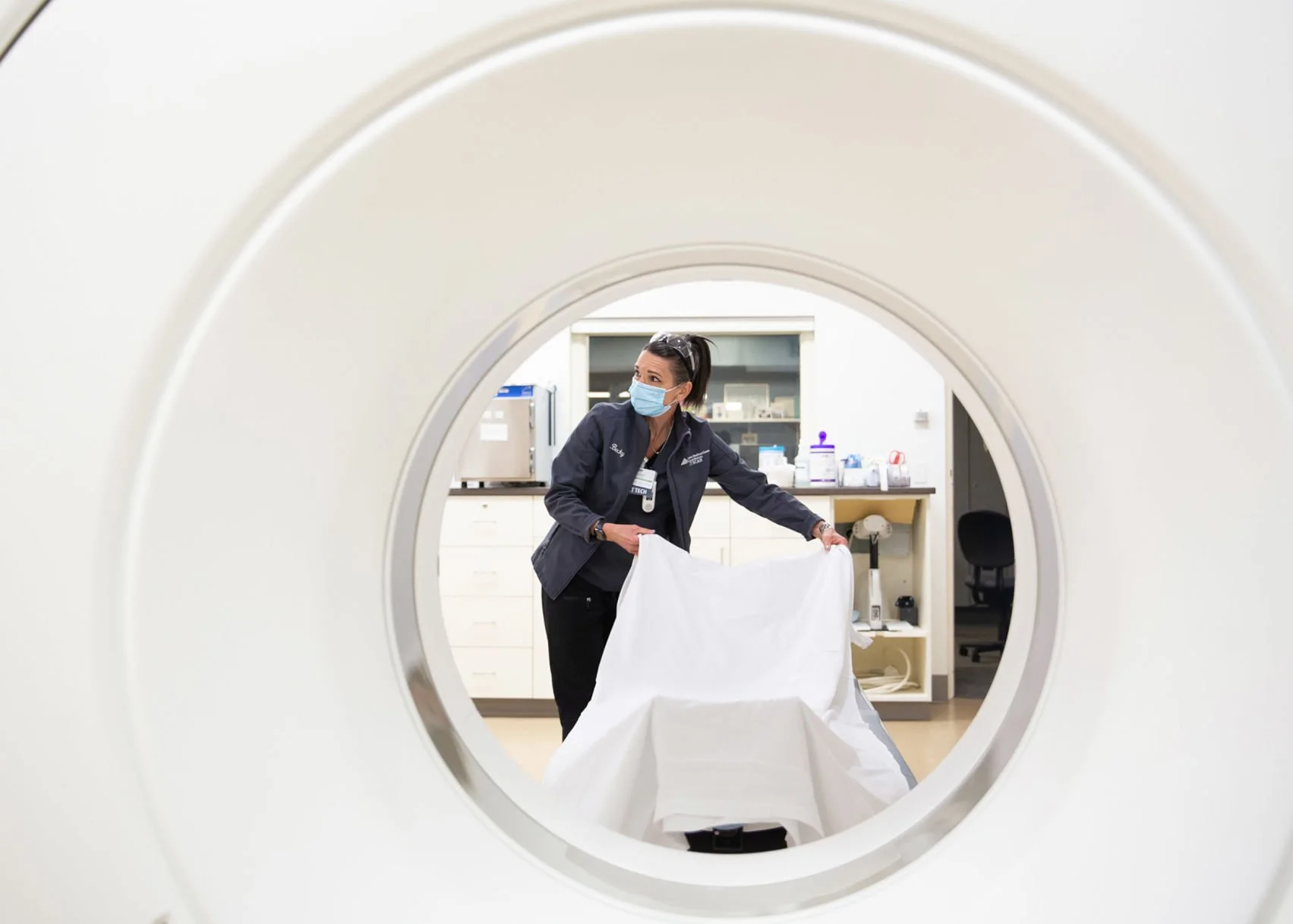 CT supervisor Becky McKinley places a fresh sheet on the table of the CT scanner in the CT, oncology and radiation room at Cheshire Medical Center Wednesday evening in Keene. Local hospitals are rationing contrast dye, used for various medical procedures including CT scans, by triaging procedures and scans during the global contrast shortage.