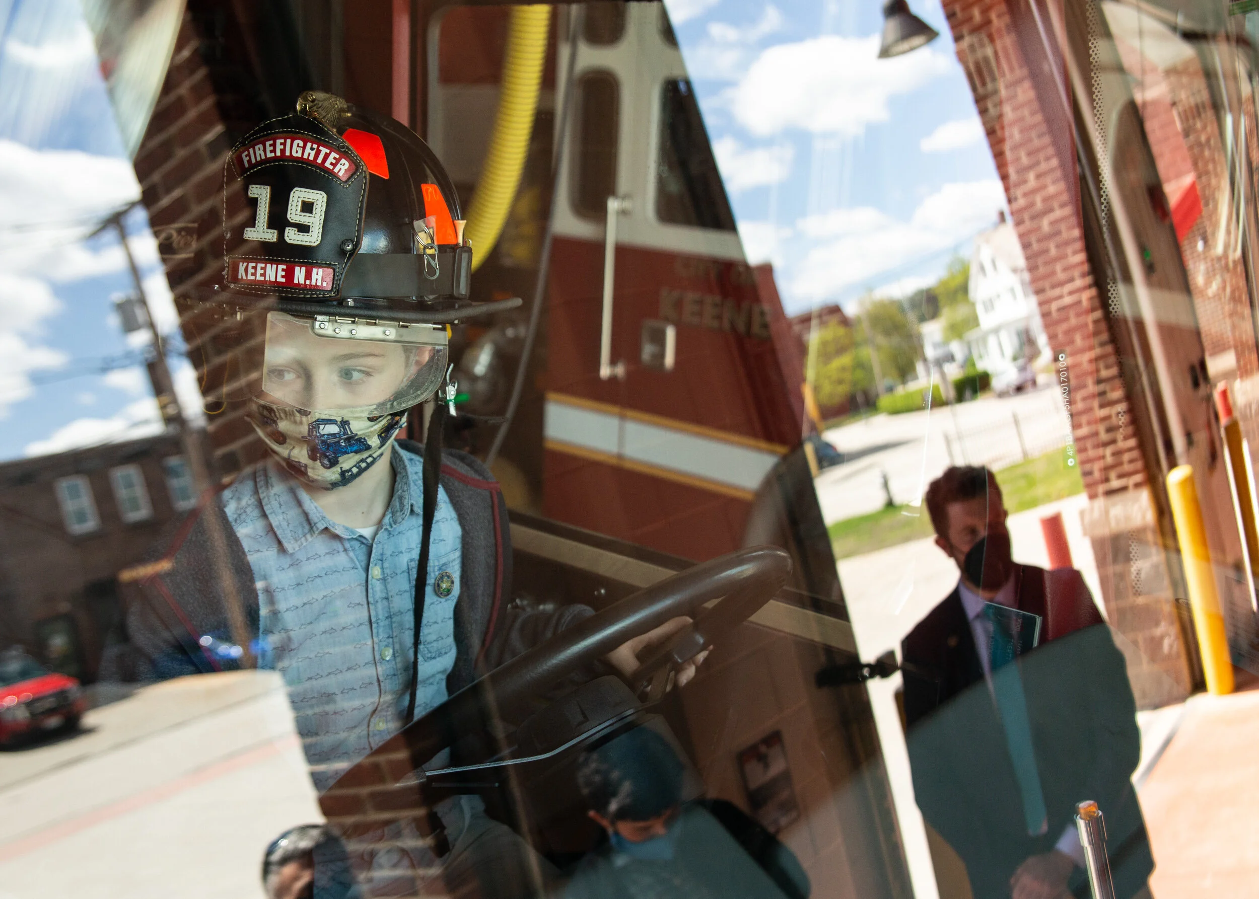 Mayor George Hansel watches George Iselin, 7, play in the front seat of Tanker 1 at the Keene Fire Department during his daylong adventure through Keene as its ‘kid mayor’. Iselin made history as Keene’s first kid mayor, a tradition that they plan to continue, that was won by his parents at an auction at Trinity Christian School in Keene.