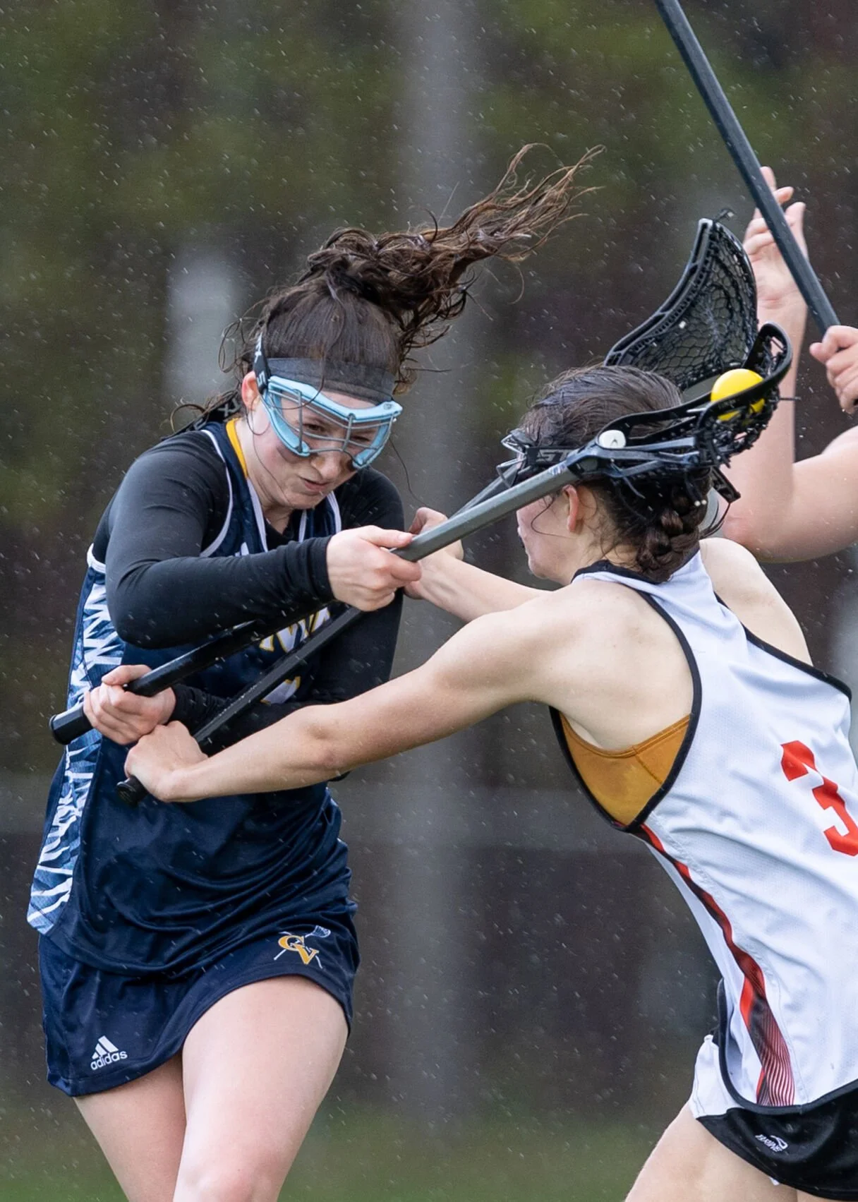 ConVal senior Addie Lustenberger (7) fights to hold onto the ball while Keene junior Ella Scaggs (3) tries to throw her off balance in the first half of their game in Keene Friday afternoon. Keene defeated ConVal 16-10.
