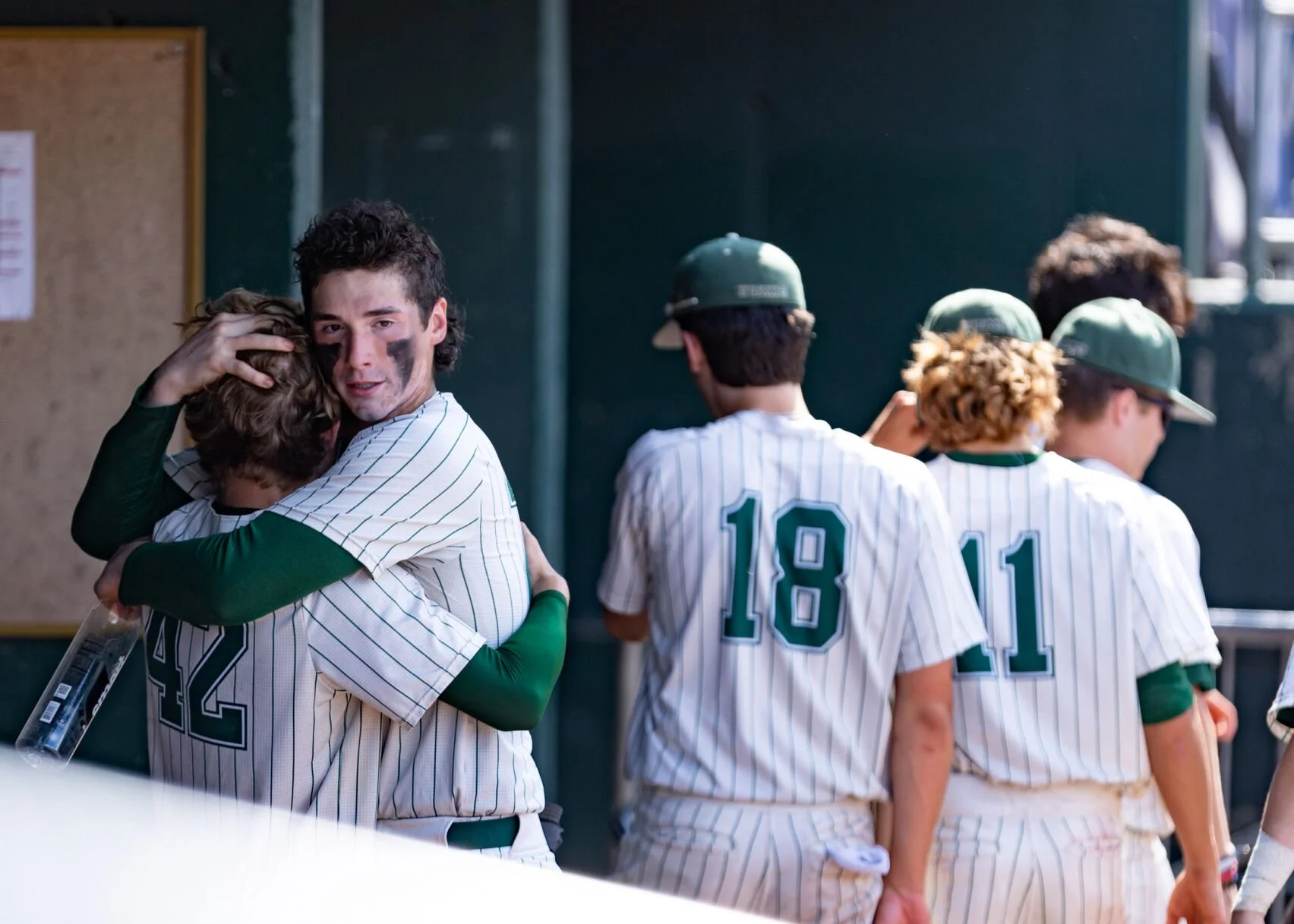 Monadnock senior Cam Olivo hugs freshman Koby Kidney at the conclusion of the NHIAA state championship game in Manchester on Saturday, June 10. White Mountains defeated the Huskies 2-0, after an undefeated season for Monadnock.