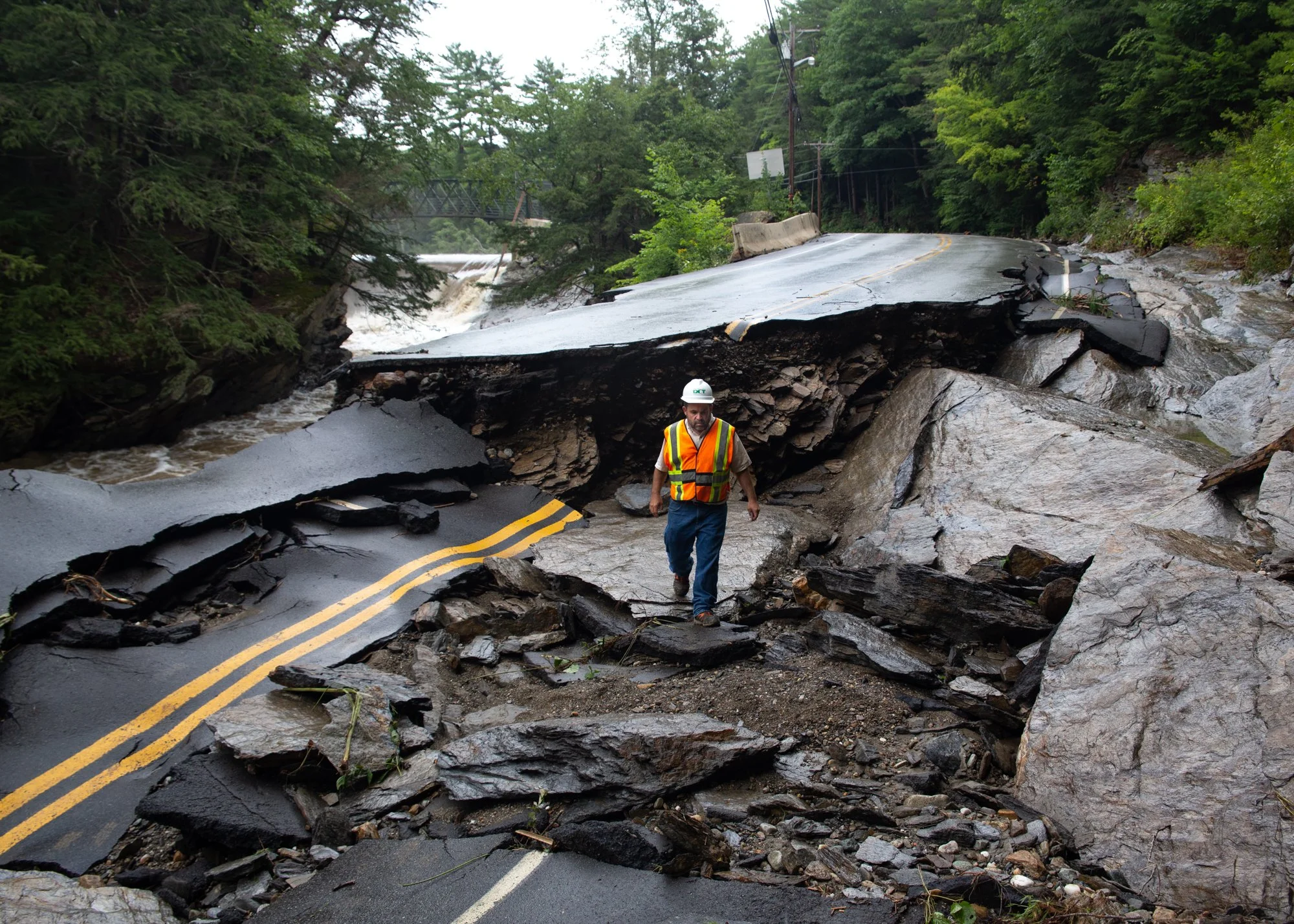 Kevin Belanger of the N.H. Department of Transportation treks through debris left behind from summer flooding along Route 123A in Alstead, New Hampshire. Crews worked all day to clean up the damage from the summer storm that washed out roads across the state to clear a path for drivers by nightfall.