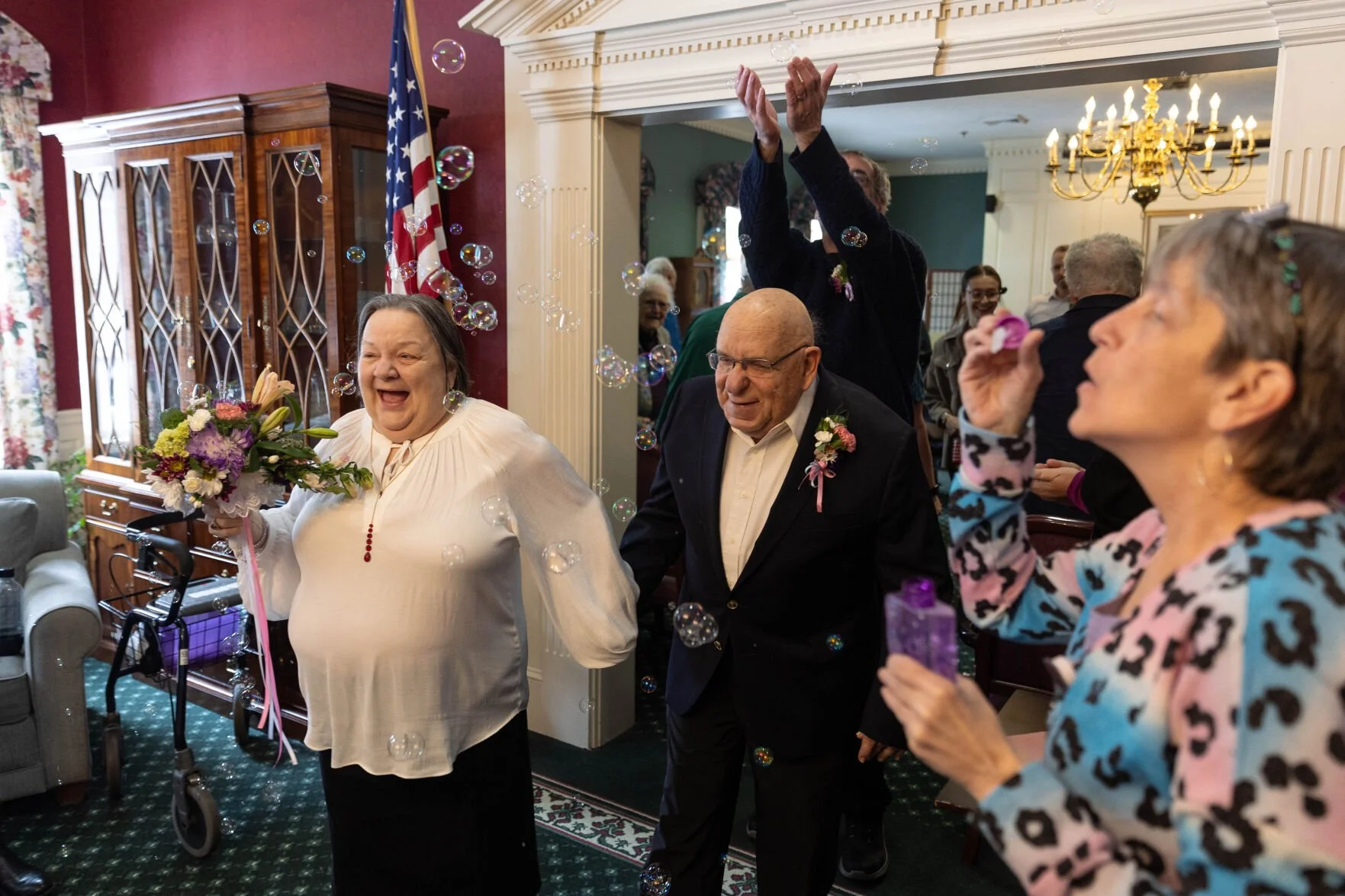 Marilyn and William MacLean laugh out of surprise and excitement as staff members of Langdon Place of Keene blow bubbles at them while proceeding down the aisle at the end of their wedding on the afternoon of Friday, April 5. “If it wasn’t for Langdon Place, I believe it was September [when I moved here], I would’ve never met Marilyn,” William toasted after the ceremony, recounting their meet-cute when he offered to take out her sore tooth with a pair of pliers.