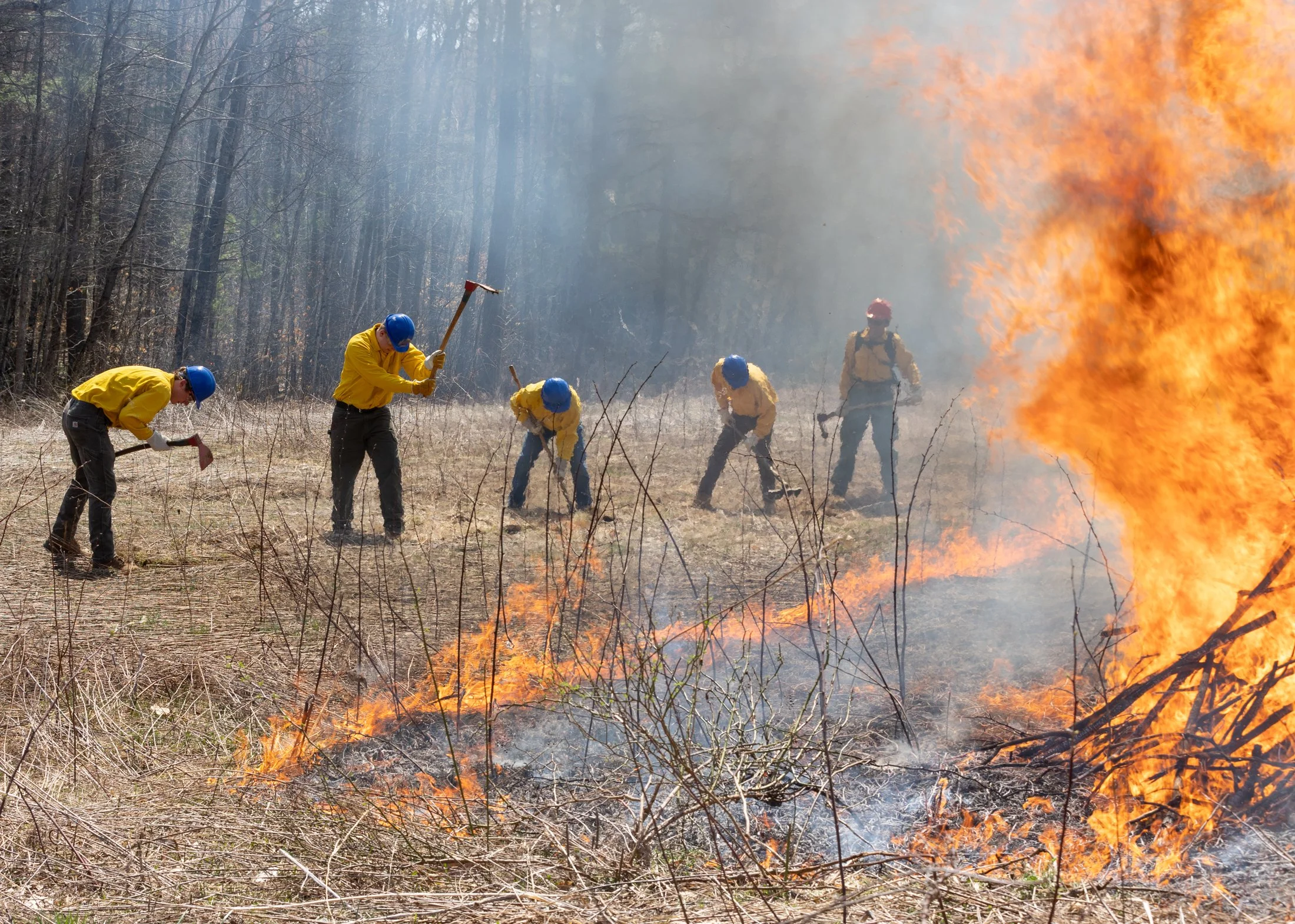 Joseph Sarcione, one of the instructors with the Cheshire Career Center for a prescribed burn at Chesterfield School, uses a flame thrower to keep the fire ablaze and within the group’s control. The event gave hands-on experience responding to a forest fire to fire science students from the career center. It also will benefit the wildlife and outdoor learning environment at the elementary school and help the students learn about the ecological benefits of controlled burns. Fifth-grade teacher Laura White said it’s important to understand the Indigenous history of caring for the land and that “fire is not something that needs to be suppressed, it’s a natural part of the environment that has an important role” — specifically when it comes to supporting ecosystems and providing nutrients for the soil.