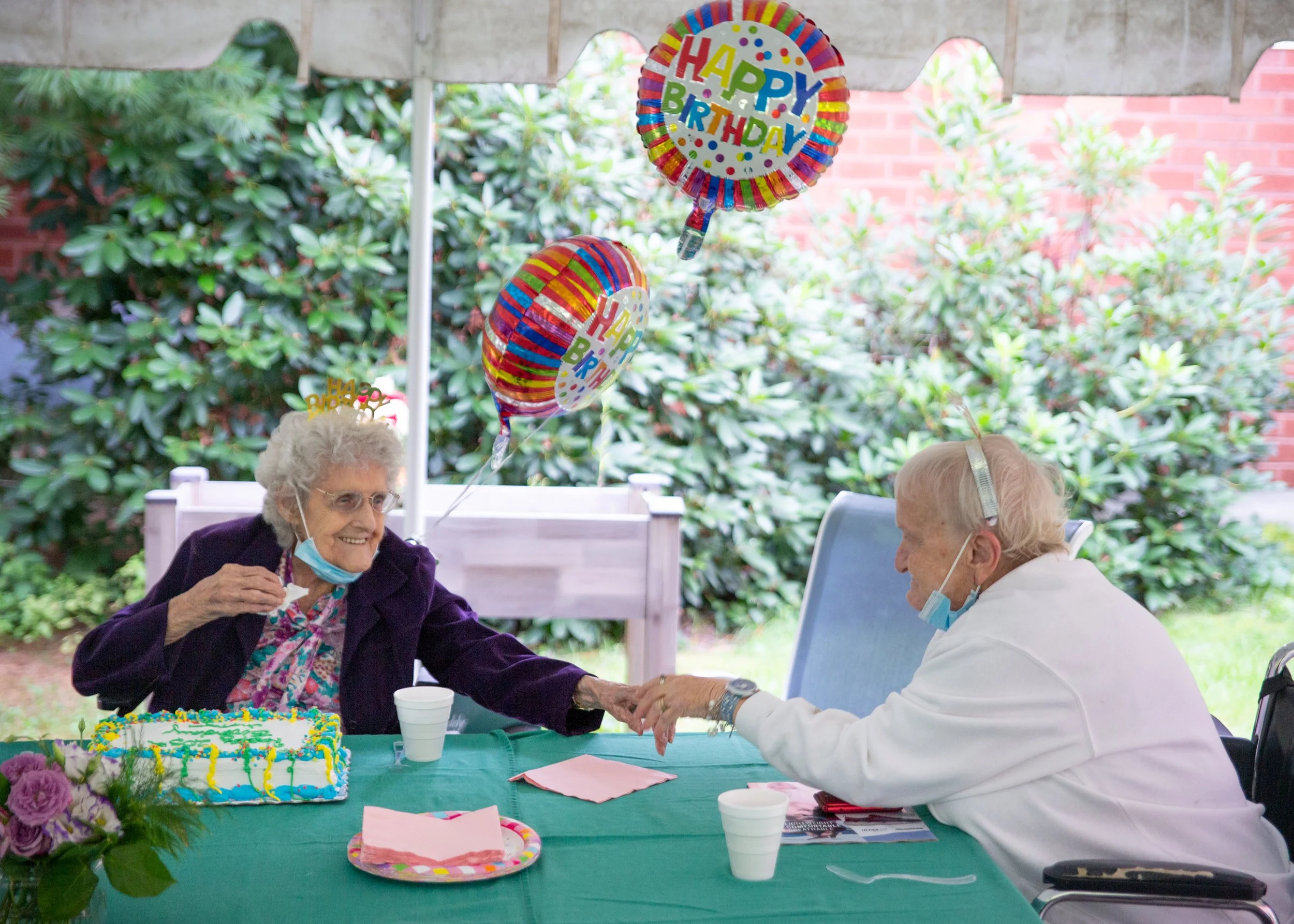 Kay Clough of Keene says hello to her friend Janette Newton during her 105th birthday party at Keene Center on Sunday. Clough and Newton have been friends since Clough was 97 and live together at Keene Center. Clough received numerous gifts related to chocolate, for which her family says she credits her long life.
