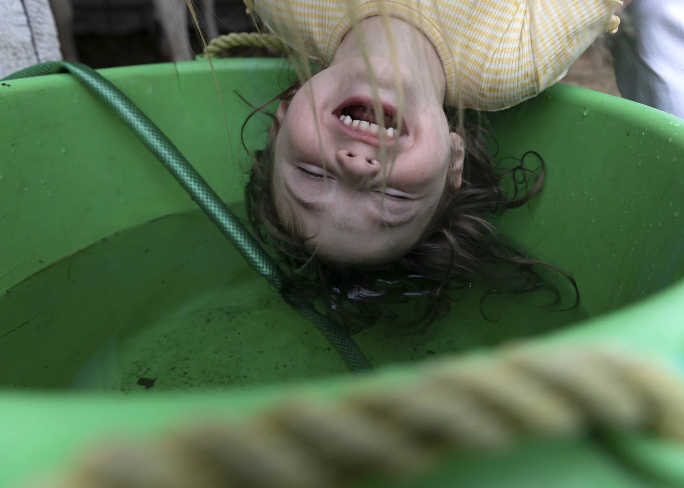 Jamie Gould, 4, asks her grandmother Janet Edwards to dunk her head in the water bucket for their cows, between bursts of laughter, after the open dairy show at the Cheshire Fair on Friday, August 4. Their cows Victoria and Athena won junior champion and reserve, respectively.